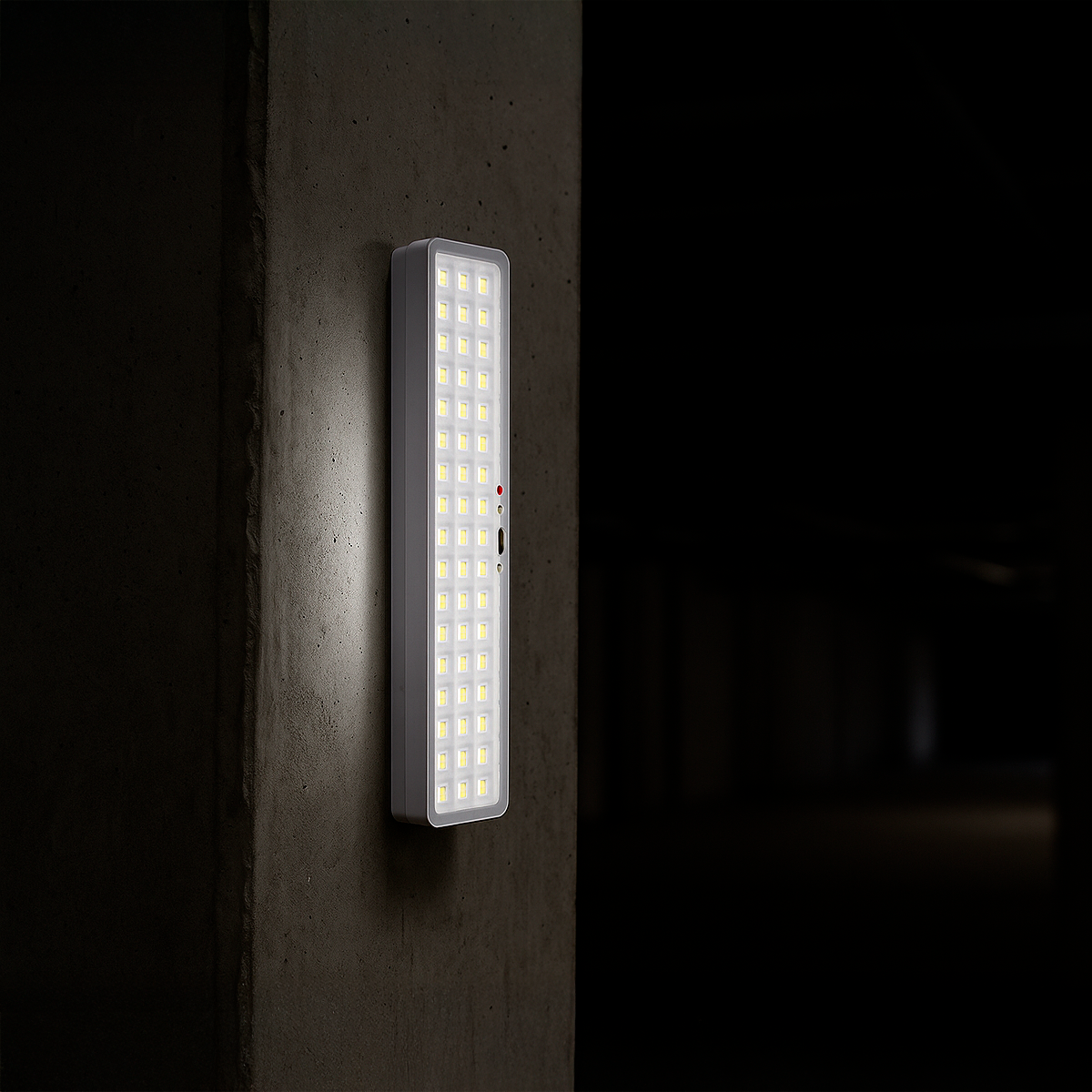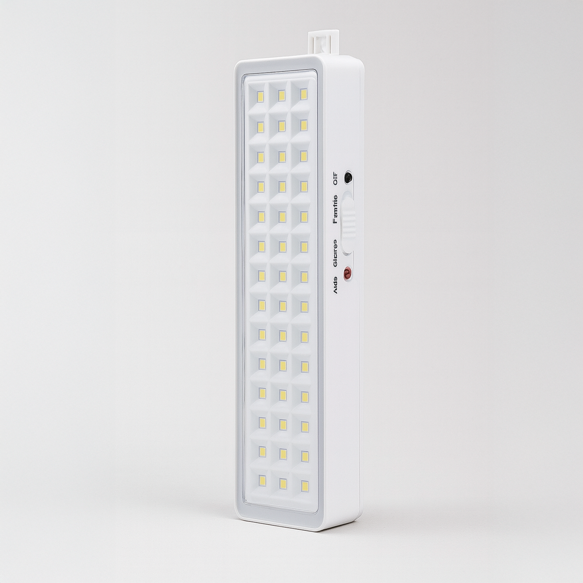 Luz de emergencia recargable con 60 LED de alto brillo, ideal para cortes de luz o zonas con poca iluminación.