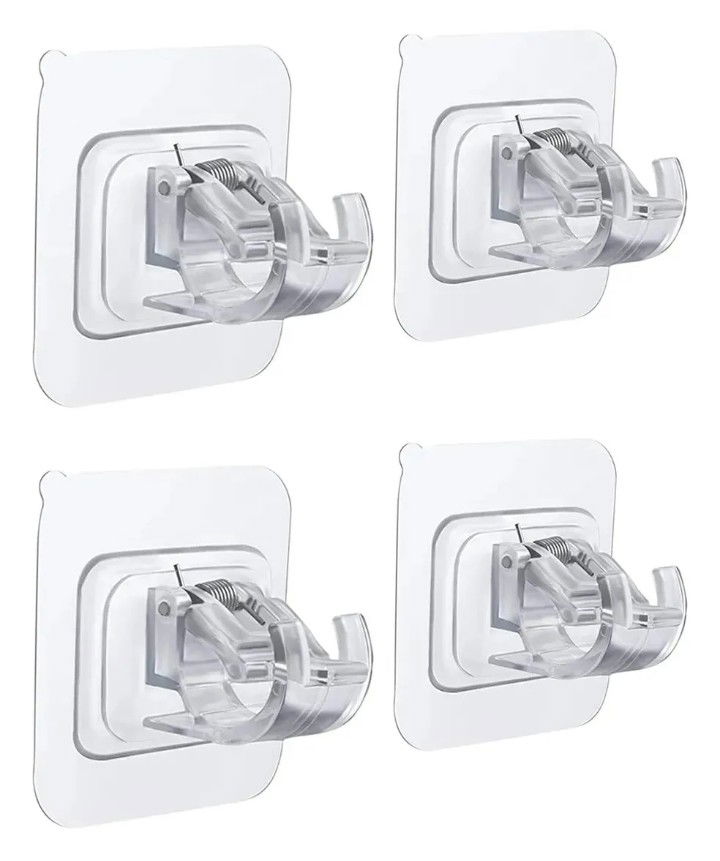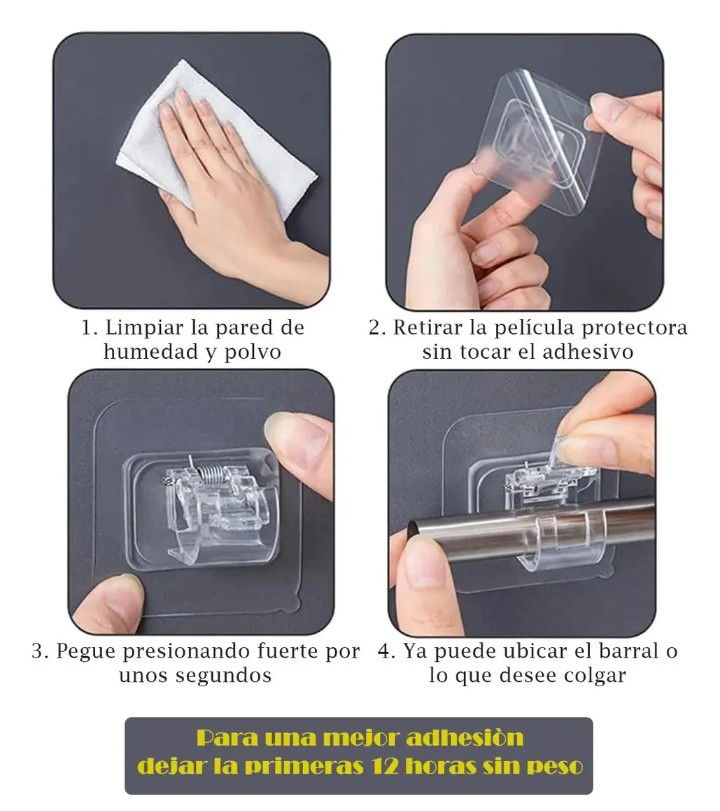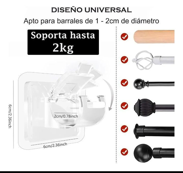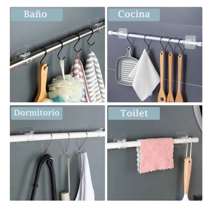 PACK X 2 GANCHOS SOPORTE PARA BARRAL: Soportes Adhesivos, no necesitas herramientas para su instalación. Su material de plástico rígido color transparente permite colocar barrales de hasta 2 cm de diametro. Fuerte adhesión en superficies lisas como: azulejo de cerámica, madera lisa, metal y vidrio. Producto sumamente útil y práctico para diversas zonas del hogar; con estos ganchos podes instalar facilmente barrales en tu cocina, dormitorio, armario, baño, lavadero, etc, sin realizar perforacione, sin necesidad de herramientas.